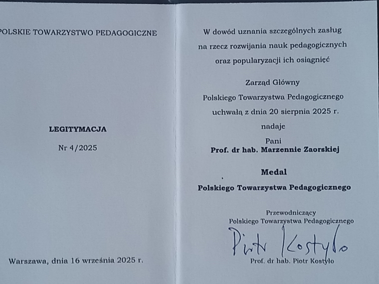 Prof. dr hab. Marzenna Zaorska odznaczona Medalem Polskiego Towarzystwa Pedagogicznego ‹ › Pełny ekran