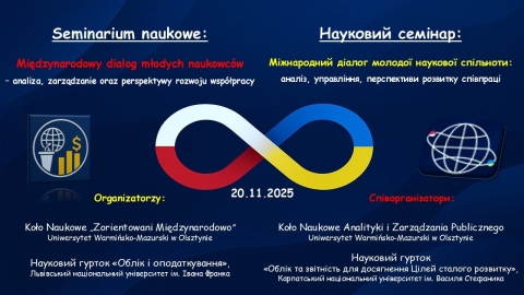 W dniu 20 listopada 2025 roku odbyło się międzynarodowe seminarium naukowe pt. „Międzynarodowy dialog młodych naukowców – analiza, zarządzanie oraz perspektywy rozwoju współpracy”. Spotkanie zorganizowano w formule hybrydowej – stacjonarnie na Wydziale Nauk Społecznych Uniwersytetu Warmińsko-Mazurskiego w Olsztynie oraz online za pośrednictwem platformy MS Teams. Łącznie w wydarzeniu udział wzięło 90 uczestników z Polski i Ukrainy.